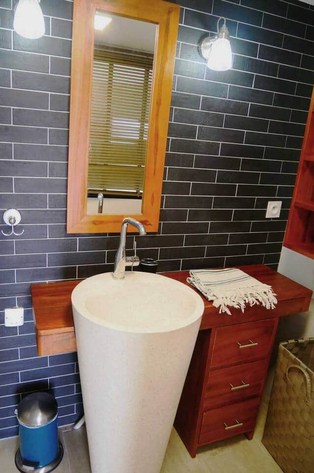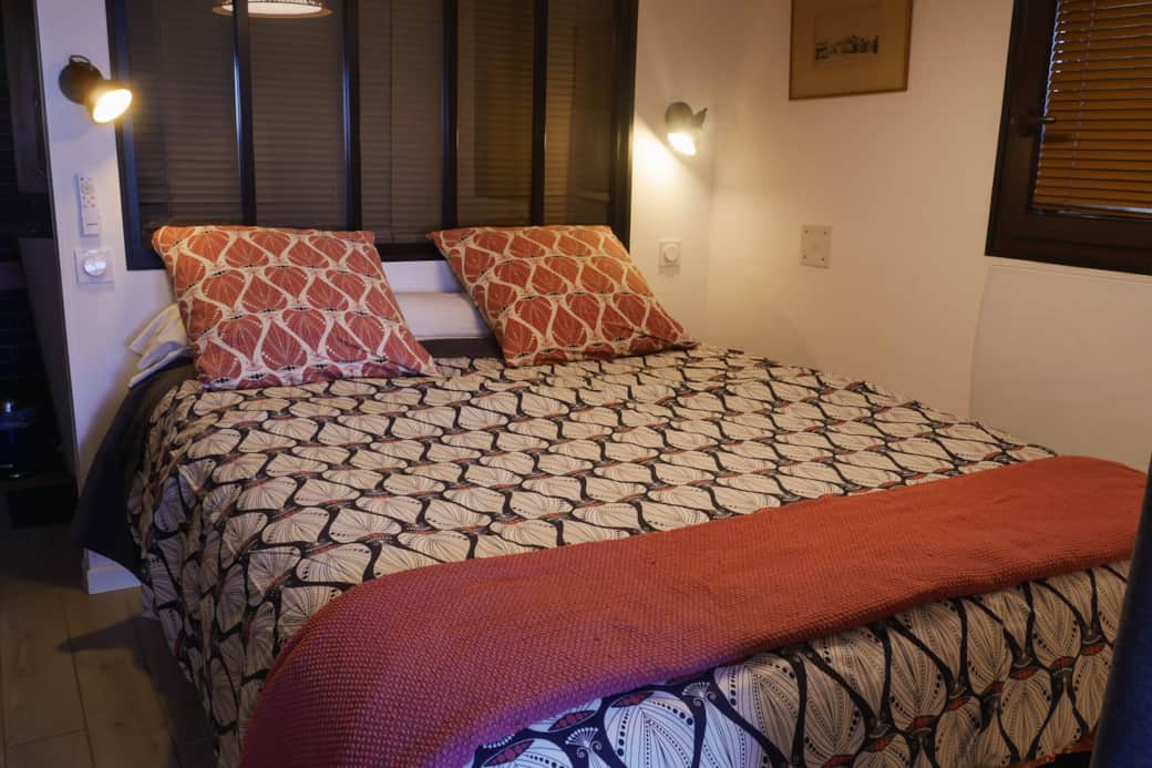 À l’intérieur, l’ambiance est plus contemporaine et élégante. Chambre séparée avec literie queen-size, cuisine équipée pour cuisiner comme à la maison, et superbe salle de bain moderne : douche à l’italienne, carreaux noirs, bois exotique, continuité du carrelage effet parquet… Un ensemble chic, sobre et chaleureux.
